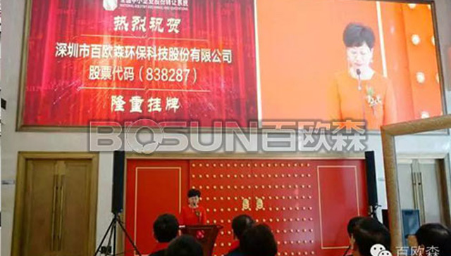 深圳市百歐森環(huán)保科技股份有限公司掛牌上市,成功登陸資本市場,具有里程碑式意義,在新的市場形勢下,為企業(yè)規(guī)模化、高標準經(jīng)營開辟了一條新路,勢必將進一步提升企業(yè)品牌影響力,帶來更加廣闊的發(fā)展空間,為環(huán)保事業(yè)做出更大的貢獻!讓我們共同期待,上市之后的百歐森即將帶給我們的傳奇精彩。